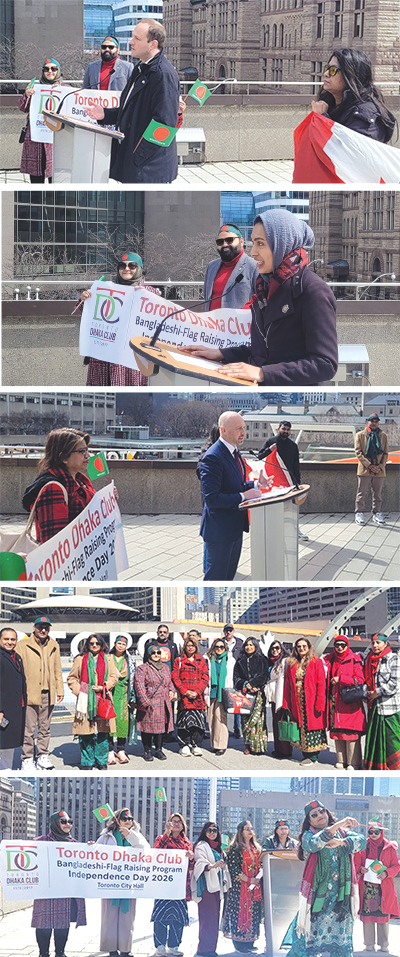 বাংলাদেশের ইতিহাসে সবচেয়ে গৌরবজনক অধ্যায় ২৬ মার্চের এই দিনটি। এ উপলক্ষ্যে গত ২৫ মার্চ দুপুরে সিটি হলের সামনে পতাকা উত্তোলনের সময় উপস্থিত ছিলেন কানাডার মূলধারার কয়েকজন রাজনীতিকও। এদের মধ্যে ছিলেন ফেডারেল এমপি ও সাবেক হাউজিং মিনিস্টার নেথানিয়েল আরস্কিন স্মিথ, সাবেক এমপিপি ডলি বেগম, টরন্টো সিটি কাউন্সিলার ব্র্যাড ব্র্যাডফোর্ড এবং কাউন্সিলার পার্থি কান্দাভেল। তাঁরা সবাই সংক্ষিপ্ত বক্তব্য রাখেন।
